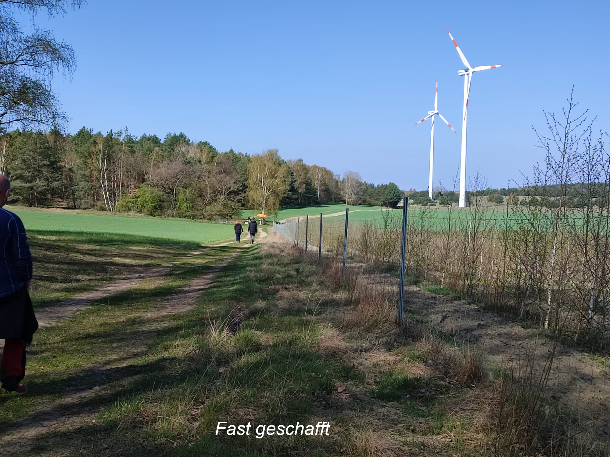 2022 04 23 AusgangspktTreffpunkt war um 8 Uhr die Kuppe des Zossener Panoramaweges. Zu dieser frühen Stunde sammelten sich 18 Wanderer im Alter von 12 bis ü70. Nach einer ersten Begrüßung ging es erst zu den Streuobstwiesen. Diese werden im Volksmund „bei Wälter-Müller“ genannt.  Hier befand ich eine große Obstplantage mit Spargel- und Beerenanbau bis in die 1960ziger. Sie bot damals vielen Frauen eine Saisonarbeit. Erzählt wurde von dem Abriß aller Gebäude und einem schrecklichen Todesfall. Weiter führte der Weg in den Wald hinein. Auf einer kleinen Anhöhe sahen wir Reste der Villa von Walther von Brauchitsch. Weiter ging es einer Eichenallee entlang. Die hier einst erbauten Kalksteingebäude der Roten Armee wurden alle abgerissen.